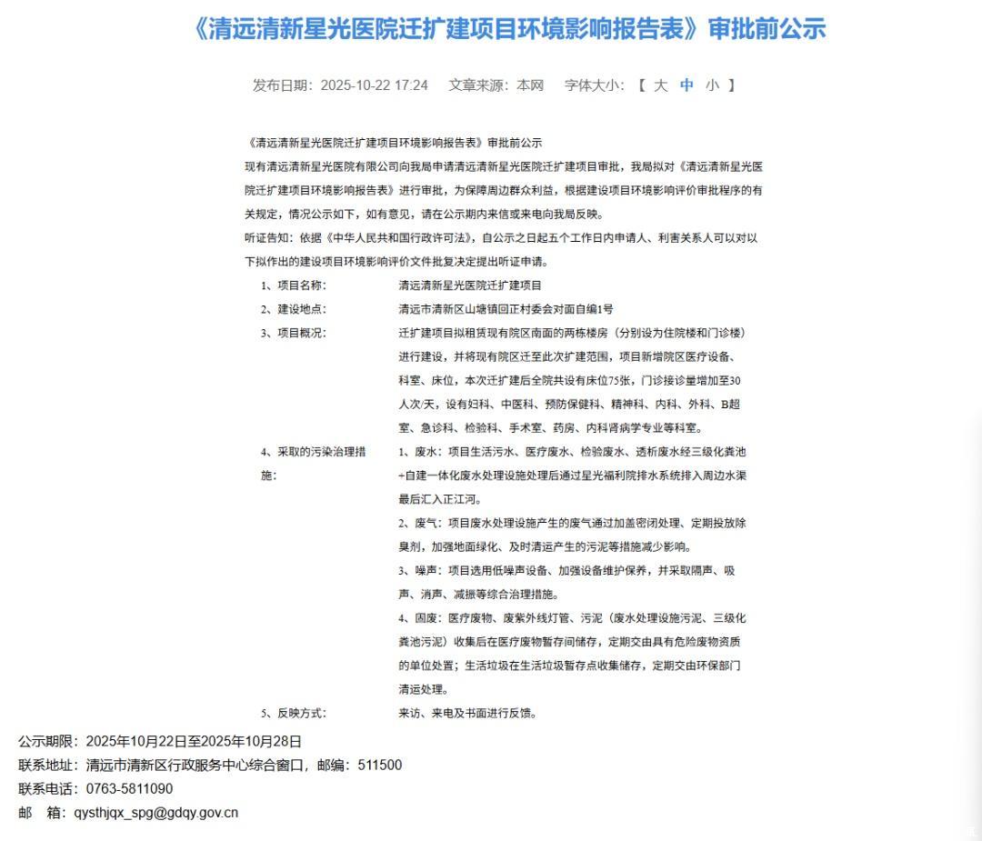 根据有关规定,近日,清新区相关部门对《清远清新星光医院迁扩建项目环境影响报告表》进行审批前公示。