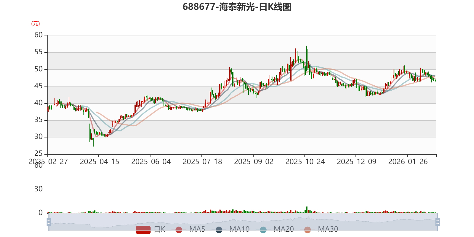 中证智能财讯海泰新光(688677)2月26日晚间披露2025年业绩快报,公司实现营业收入6.03亿元,同比增长36.08%;归母净利润1.72亿元,同比增长26.79%;扣非净利润1.66亿元,同比增长28.67%;基本每股收益1.44元,加权平均净资产收益率为13%。以2月26日收盘价计算,海泰新光目前市盈率(TTM)约为32.49倍,市净率(LF)约4.23倍,市销率(TTM)约9.75倍。