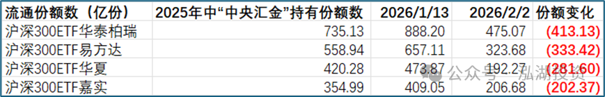 根据泓湖投资的分析和统计(下图),业内规模较大的四只沪深300ETF指数基金,从2026年1月13日到2026年2月2日,其场内规模均出现明显减少,且减少份额超过1200亿份(根据下图数字合并计算)。